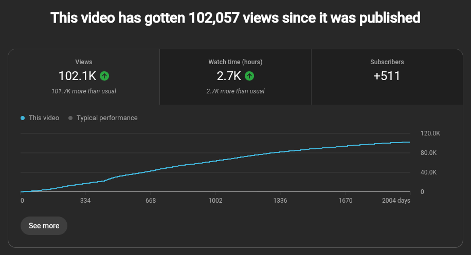 This more relaxed attitude leading to success isn’t isolated to Dark Souls playthroughs. My Discord server was made on a whim six years ago for people to discuss a YouTube tutorial series I was working on at the time. That series was also born out of a spur-of-the-moment decision. I didn’t create it expecting a lot of views. And yet, to this day, part 1 of that series is my most viewed video by a long shot, sitting at just over 100k views at the time of writing! And it’s still getting views to this day.
